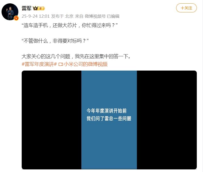 据悉,小米将于9月25日晚7点举办雷军年度演讲,主题为《改变》,揭秘小米玄戒芯片和小米汽车背后的故事。